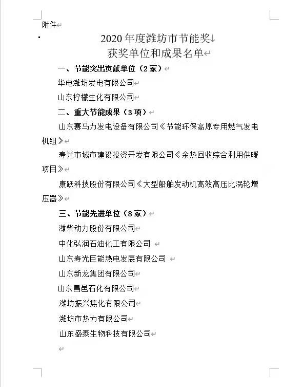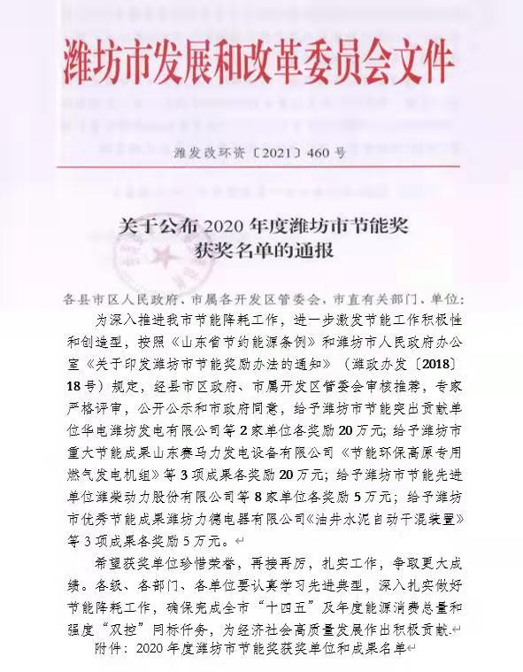 近日,在濰坊市發展改革委員會組織的節能先進單位評選中,振興焦化公司榮獲2020年度“濰坊市節能先進單位”稱號,并獲獎金5萬元。