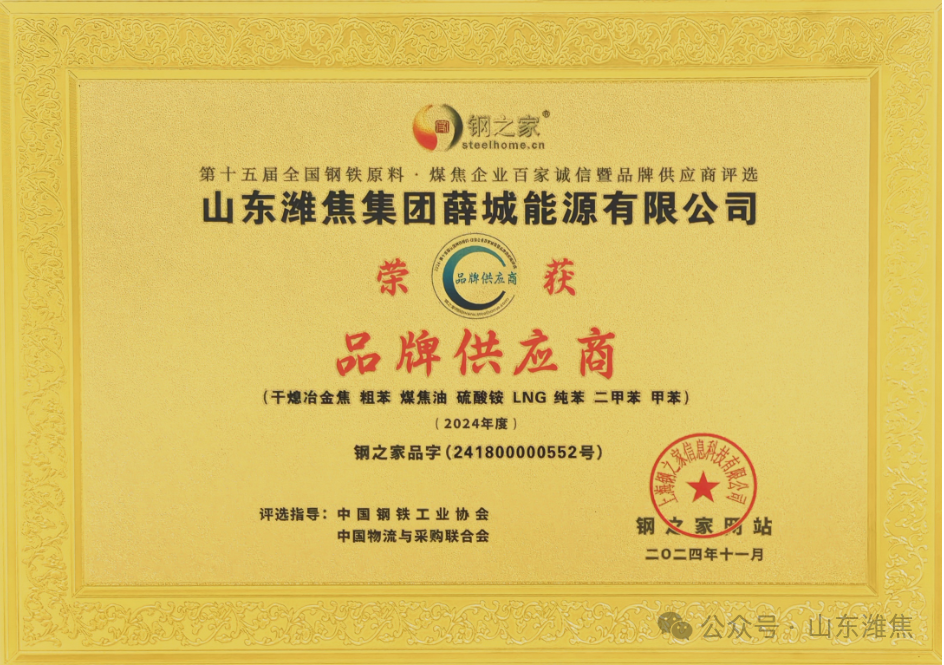 近日,“鋼之家第十五屆全國鋼鐵原料·煤焦企業(yè)百家誠信暨品牌供應(yīng)商”評選活動(dòng)順利舉行,經(jīng)鋼之家網(wǎng)站征信取證,中國鋼鐵工業(yè)協(xié)會(huì)及中國物流與采購聯(lián)合會(huì)專家評審,薛城能源公司被評為2024年度“品牌供應(yīng)商”殊榮。